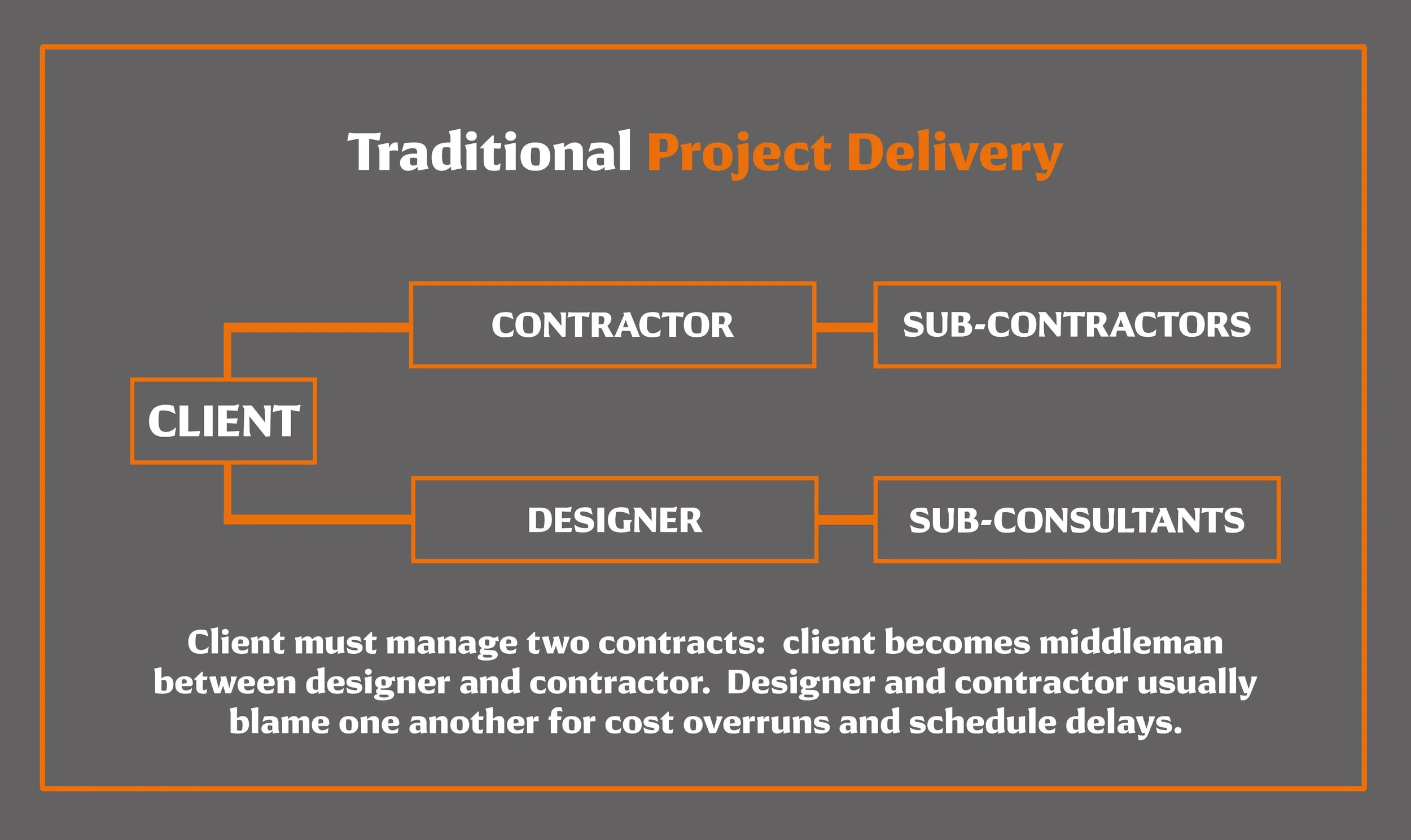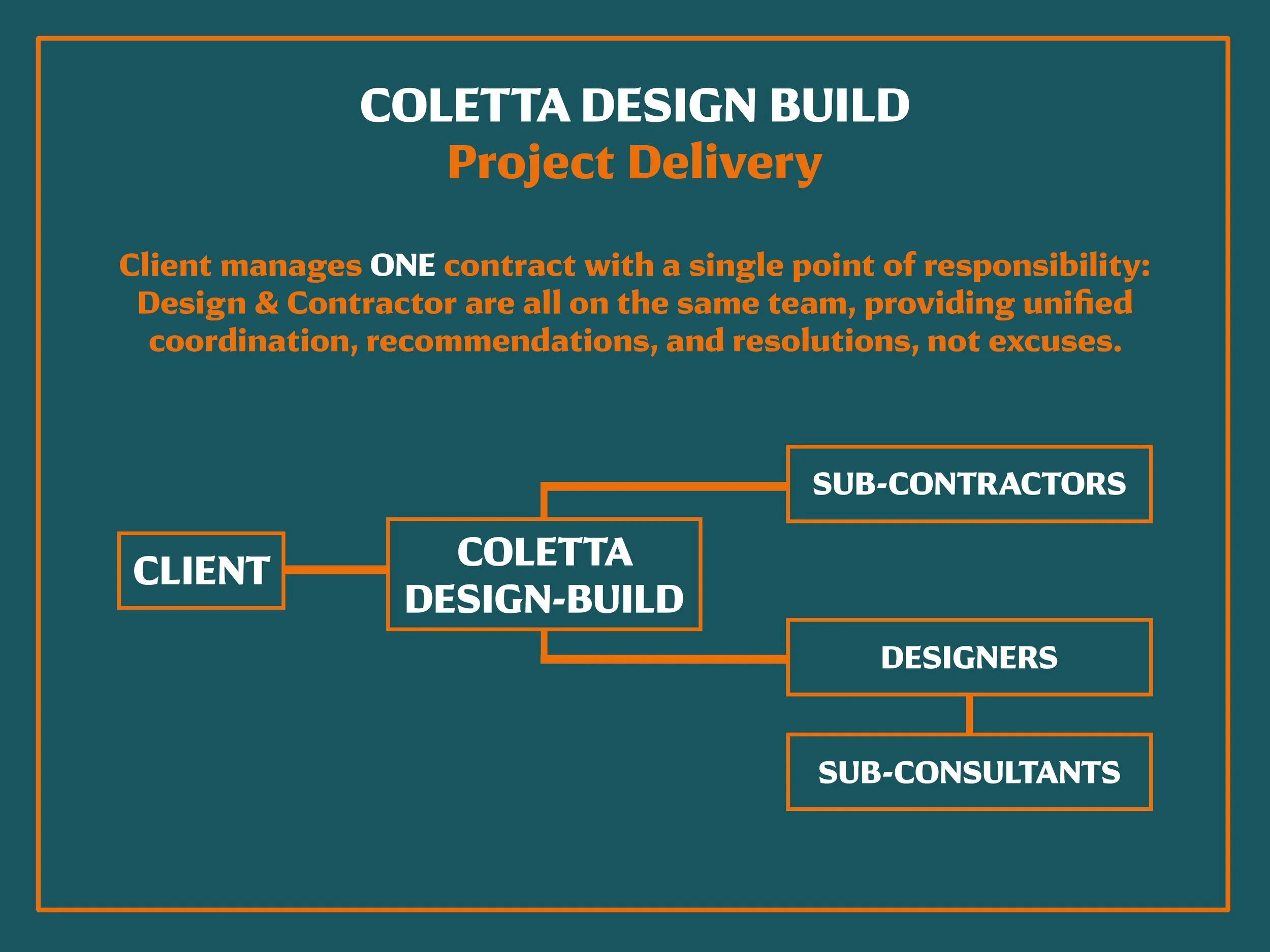With typical Design - Bid - Build construction project, communications breakdown is inevitable, risking budget impact and schedule delays. With Coletta Design Build, we reduce risk with greater efficiency and coordination with having all teams reporting to A SINGLE PROJECT MANAGER, where all communications are streamlined.